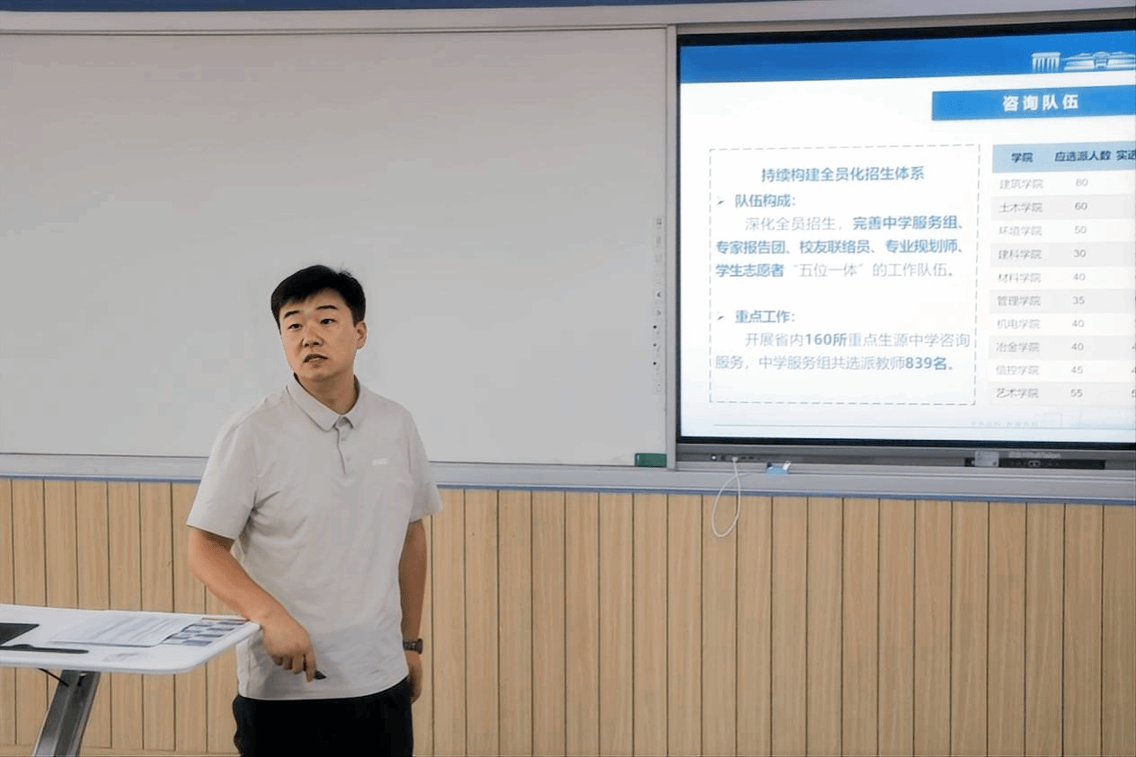 屈超对2025年新高考政策进行了详细解读与说明,并逐项阐释了我们招生工作的重点并对学校招生宣传工作的主要内容进行了细致地讲解和培训。他还就如何精准对接目标生源、提升学校吸引力等方面分享了实用经验,现场互动气氛热烈。