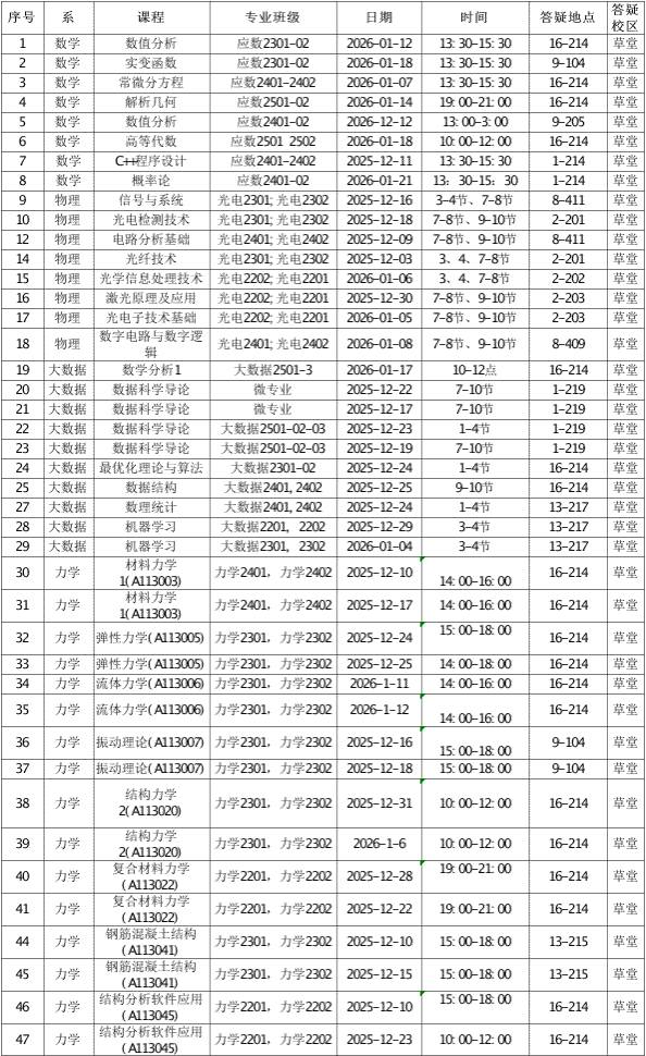 2025-2026-1Ray竞技官网专业课期末考前答疑安排